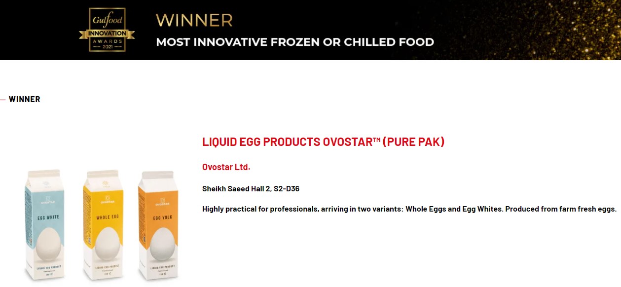 This year, Ovostar has presented our latest product range LIQUID EGG PRODUCTS OVOSTAR ( Pure Pak ). The product range was awarded by the Gulfood Innovation contest. The liquid eggs are presented in a well-designed, eco-friendly carton packaging offering a practical and safe solution for the professional kitchens in the foodservice sector. All products offer the same taste, functionality, and consistency as fresh eggs. Products are thoroughly homogenized and pasteurized. Key advantages are no risk of contamination, longer shelf life, waste-free and convenience for storage due to the compactness of the product.